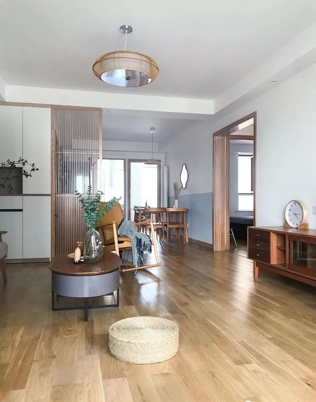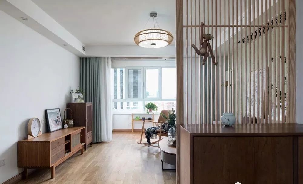 门厅 客厅 进入客厅,樱桃木色的中式风格家具搭配枫木色的地板,清新利落。 客厅沙发背景选择了清新淡雅的灰绿色为背景,靠在沙发上竹韵和农作装饰画,还有绿植的点缀,自然清新且韵味十足。 大面积的窗户选择了灰蓝色布艺窗帘,柔化了空间,同时也与餐厅的墙色相互呼应。靠阳台放着的摇椅是女主非常心仪的家具,也很符合这个家的气质。 业主挑选的有收纳功能的茶几,六个小细腿做支撑,稳重又不会显得笨重。 餐厅 餐厅与厨房、书房相邻,采用玻璃移门相隔,采光、通透性完全不受影响。 餐厅区没有用传统装饰画,用的是‘四瓣梅花镜’装饰。取对面玄关的景,让餐桌边墙不会单调。 灯罩颜色和纹路跟桌子一模一样,而光源偏暖,照在桌子上,原本的桌面颜色立刻变的鲜艳起来,营造出了温馨的就餐环境。 厨房 厨房吊柜、地柜选了两种颜色,由于本身厨房过道只有95cm,做成白色吊柜视觉上会显示宽旷。 书房 女主人喜欢百叶光影斑驳的样子,在书房用了百叶窗。整屋还是樱桃木色的家具,与整体风格格调保持一致。 书桌上的文房四宝,文化文艺气息浓厚。 主卧 主卧卫生间的墙内移1320宽,让卧室空间更宽敞。衣柜和墙留了80宽的空隙,安装了入墙式推拉门,即便开着门也不会占用空间。 15平米大主卧,还拥有一个独立的阳台,空间宽敞舒适。 床头灯打开后,灯光像水墨画一样层层晕染开来,粉灰色墙代替传统的红色,点缀新中式风格。 次卧 次卧是方便父母偶尔过来小住,做了进深600的衣柜,床头处做了一面书柜,放些书箱方便随手取阅。 卫生间 主卫用木作做壁挂马桶柜盖板代替了原本的石材,让冰冷的石材增加一些温暖的触觉,也和房间整体风格呼应。还做了280*300的MINI洗手台,一个人用足够。 这个角度看过去,有点像徽派建筑的设计手法,八角格窗很有感觉。虚实之间的变化,增加空间层次感,避免闭塞拥挤。