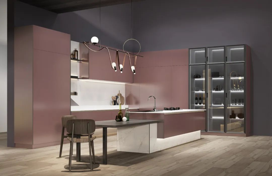 蒙巴纳斯选用了独特的釉砂红 作为主色调辅助以釉砂灰 、釉砂白,为厨房空间注入独特的个性,颜色柔和优雅,每一处都能彰显个性与品位。