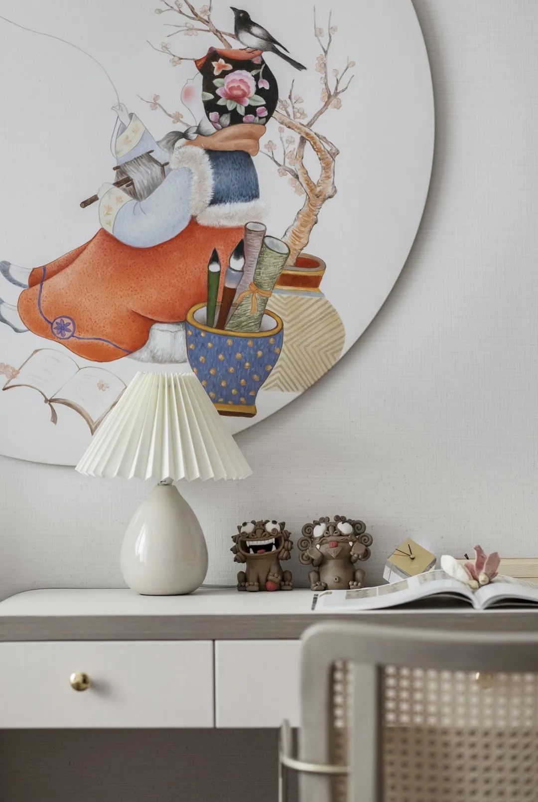 阅读使人闲适,墨香使人静宁。几本日式书籍,充满禅意的几处细枝绿叶,同样散发着温度的宣纸拼贴画,足矣营造出居住者憧憬的生活向往:坐看云起,展卷闲茗,诗意栖居,方寸净明。