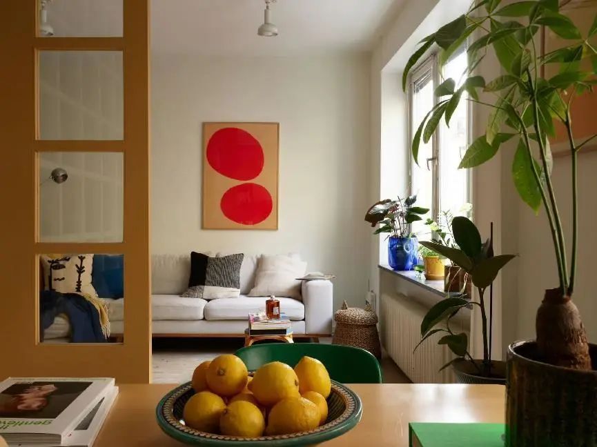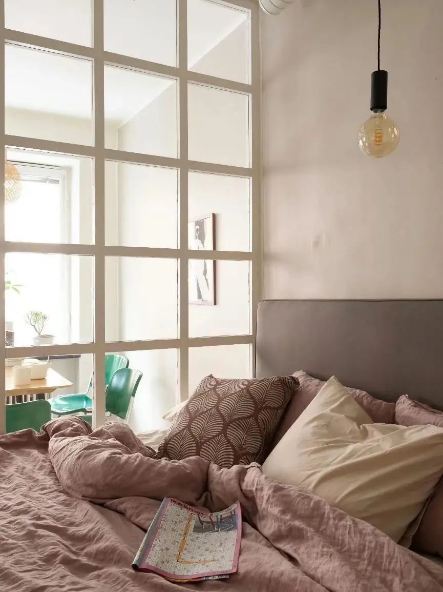 在白墙和浅色木地板基本组合的背景下,无主灯的设计和推拉门的设计保持了客厅和餐厅的分隔和宽敞明亮,黄色的推拉门就像一幅流动的装饰画。 天突然亮了,闭上了也不失一片柠檬黄的景色。增加了活力,看起来很有活力。 虽然只是一个小小的空间,却因为像新鲜柠檬一样的配色而充满了生命力。暖黄色与绿色椅子的颜色相碰撞,复古又有新意。 ▲餐厅与客餐间柠檬黄隔断的张扬相比,绿色的椅子给人一种舒适耐用的美感。 搭配实木餐桌简洁的造型,白天可以感受到大自然般的清新气息,夜晚与竹制吊灯倾泻而下的光影碰撞。有一颗饱满的心,房间就永远不会黑暗。 如果想在小空间里划分空间,玻璃隔断营造出透光不阴影的感觉,对于小户型来说真的是一个不错的选择。就像这里一样,卧室和餐厅被一个白色框架的玻璃网格隔开。这样的设计不仅给休息空间带来了明亮的光线,也让原本只能容纳一张床的空间显得更加宽敞。 玻璃隔断看起来是一个规则的形状,但实际上感觉非常有趣。带着朦胧的美感,无论你在床上摆上什么,都像是一幅优雅的油画。 窝在舒适的小窝里,享受一段舒适温馨的时光,而阳光照在玻璃上,有了自己的滤镜,那可说是美好而自然。 厨房区域是一个非常巧妙和实用的利用每一寸空间。 尤其是转角储物柜的设计,白色橱柜和不锈钢台面的组合不仅让小小的空间拥有了咖啡角和储物区,也让家变得更有条理也更加简洁大方。 在这里,也告诉我们,在小户型里,尽量不要遮住窗户带来的光线,这也是让空间显得“宽敞”的极好方法。另外,电视墙换成了移动电视架,这也符合如今人们的生活需求。 这个家的主色调是奶白色,整体很温和简约,但是如果用在整个房子里就太单调了。设计师的匠心之处在于,通过明亮的色彩点缀,增加室内空间的层次感。 白色的小砖与不锈钢金属搭配起来并不容易。最重要的是卫生间洁具的整洁与规划。虽小,却依然做到了干湿分离,并通过地砖带来了一些变化。可以说麻雀虽小,五脏俱全都有了。餐厅
