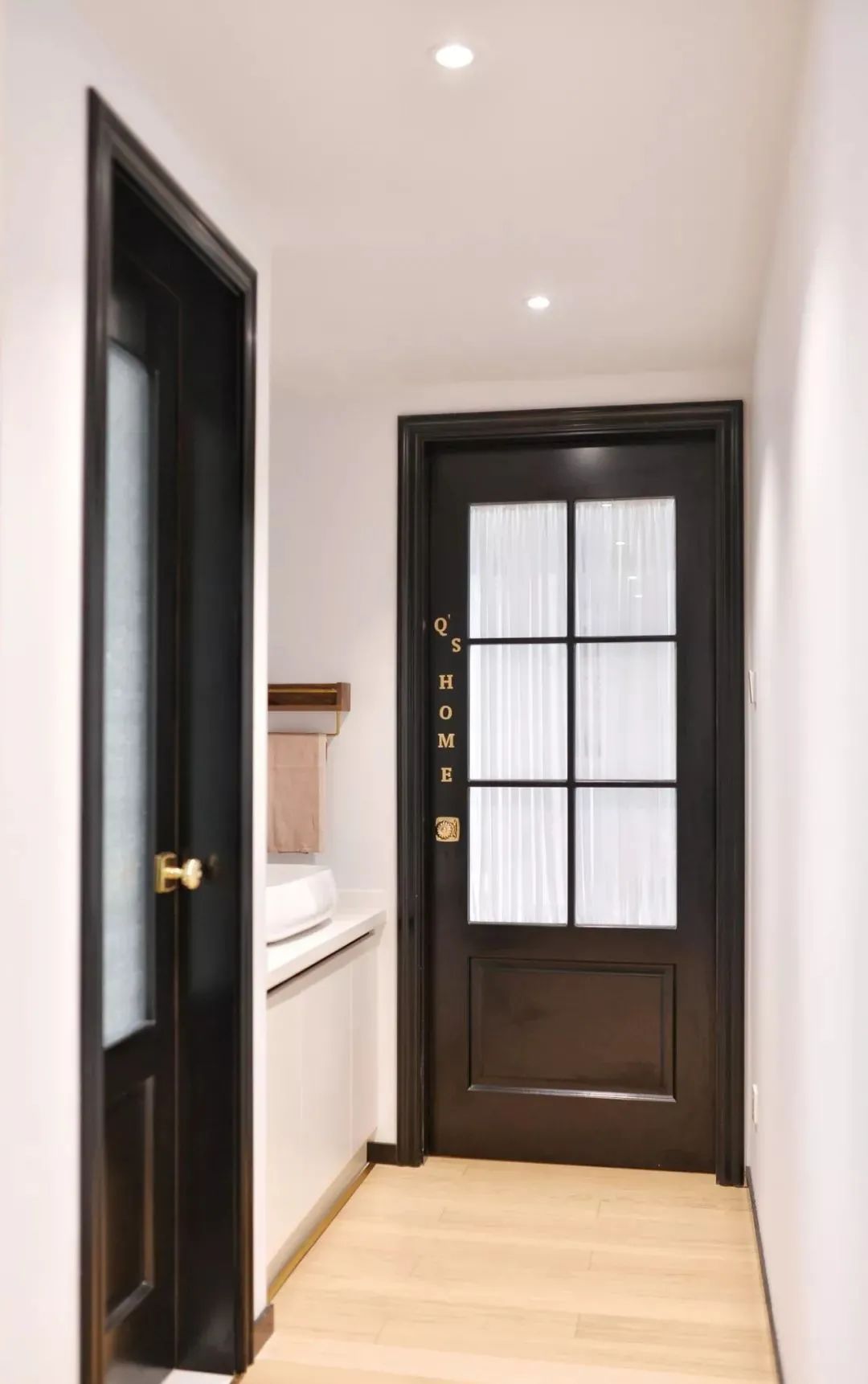 ▲入户走廊型玄关,进门左手边定制顶天立地的玄关柜,通体白色的柜体,有效地放大视觉空间。 ▲拆除了原本厨房与客厅的隔墙,做LDK开放式布局,看起来宽敞了不少。客厅临窗区域设置了阅读休闲角,在飘逸窗纱的衬托下,变得柔和唯美。 ▲客厅与厨房之间定制吧台作为隔断,同时也作为餐厅,空间利用最大化。 ▲厨房空间小,整体以白色为主,墙砖选择了纹理感丰富的小砖,在视觉上拉伸空间。橱柜右侧预留了部分开放式隔断,可将清洁用品都收纳在这边。 ▲卧室门采用了全黑的复古玻璃木门,搭配黄铜把手和装饰字,精致文艺。飘窗没法改动,便借上下沿做了分色处理,利用定制的飘窗垫,将飘窗改成了休闲角。 ▲卫生间,将洗手台外移,并在内通过浴帘+挡水条,做彻底的三分离设计,干净清爽易打理。