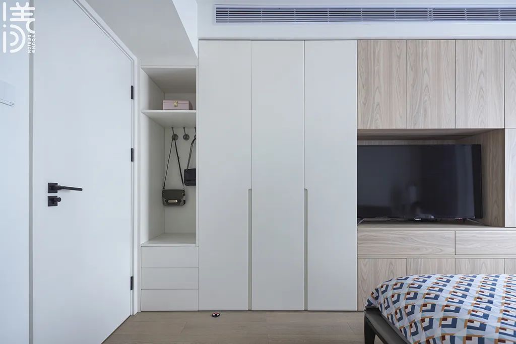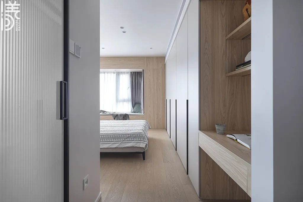 客厅 ▲现代洁净的客厅空间,没有什么繁杂的设计,以简约大方的硬装,地面铺上木地板+地毯装饰,搭配温馨舒适的家具软装,营造出一种自然轻松的居住氛围感。 ▲电视墙以定制柜+地台的组合,整体柜门白色为主,中间留空出原木色的空格,电视机就壁挂在中间空格位置,实现了一个简洁大方的空间画面。 ▲沙发墙以长城板打底,装上一块白色平整的护墙板,布置上灰色布艺沙发,呈现出一种文艺精致的现代感。 ▲客厅中间布置一张方形的岩板茶几,边上搭配皮艺休闲椅,整个空间充满现代舒适的气息。 ▲沙发两侧布置边几与端景吧台,布置陶艺花瓶装饰,也让空间显得更加文艺高级。 餐厅 ▲餐厅与客厅连通,保持一致的现代风格格调,木地板+白色的定制柜,定制柜里加入木色柜格,整个空间显得简约现代而大方优雅。 ▲餐厅洁净的墙面空间,中间摆上一张圆餐桌,搭配铁艺架的布艺坐垫餐椅,使得用餐空间充满文艺精致的高级气息。 ▲餐桌上摆上花瓶装饰,后方餐边柜加入水槽,摆上小电器,为一家人提供了方便舒适的用餐氛围感。 ▲餐厅背景墙上挂一幅极简风的装饰画,搭配在净白的墙面,加上餐桌上花瓶的鲜花装饰,带来的是一种简洁大方的设计气息。 ▲餐桌上方吊装一盏 椭圆球状的吊灯,而旁边装饰画上也加入射灯设计,让空间照明温馨优雅而有层次感。 厨房 ▲厨房里面设置了中岛吧台,与厨房操作台布局成U字形的操作台空间,为主人提供了方便舒适的烹饪空间。布置冰箱、原木色的嵌入式电器柜、还有洁白的橱柜与吊柜,整个厨房空间显得简约舒适而实用。 ▲厨房临窗,采光条件较好,做饭的时候也有明亮的视线环境。 ▲橱柜与吊柜白色为主,采取无拉手的设计,整体设计简洁大气。 卧室 ▲卧室进门右侧装一整排的衣柜+梳妆台组合柜,整体空间墙面与地面都是原木色的搭配,使得空间充满实用简约的设计感。 ▲窗户边框、墙面等位置都以木饰面包围,整个空间充满自然简约的氛围气息。 ▲衣柜最右侧、靠近门口位置,加入一个台面与衣柜做成一体,布置凳子成为梳妆或工作的小空间。 ▲黑色实木床头柜,摆上白色小摆件,侧边做一个小小的入墙式收纳柜,实现了现代优雅而又实用的空间利用。 次卧 ▲次卧空间也是以现代简约为主,在布置上灰色皮艺床与窗帘后,床头柜上布置花瓶+吊灯,营造了一个现代简洁而优雅舒适的卧室空间。 ▲床尾装一排的衣柜,门后空间加入开放格做成包包收纳区,中间加入开放格与抽屉,做成电视柜的功能设计,让卧室空间显得更加现代简约而实用。 榻榻米房 ▲榻榻米房除了门口区域,整个空间做成抬高地台设计,垫上布艺垫子,布置小茶台,为主人提供了一个休闲、互动、喝茶聊天的多功能空间。 ▲家里来客人的时候,这个榻榻米房还能充当客房使用。 卫生间 ▲主卫与公卫都是统一的风格打造,浅灰色的墙面地面,淋浴房内装上防滑扶手,整个卫浴空间干净简洁而大方。 平面布置图