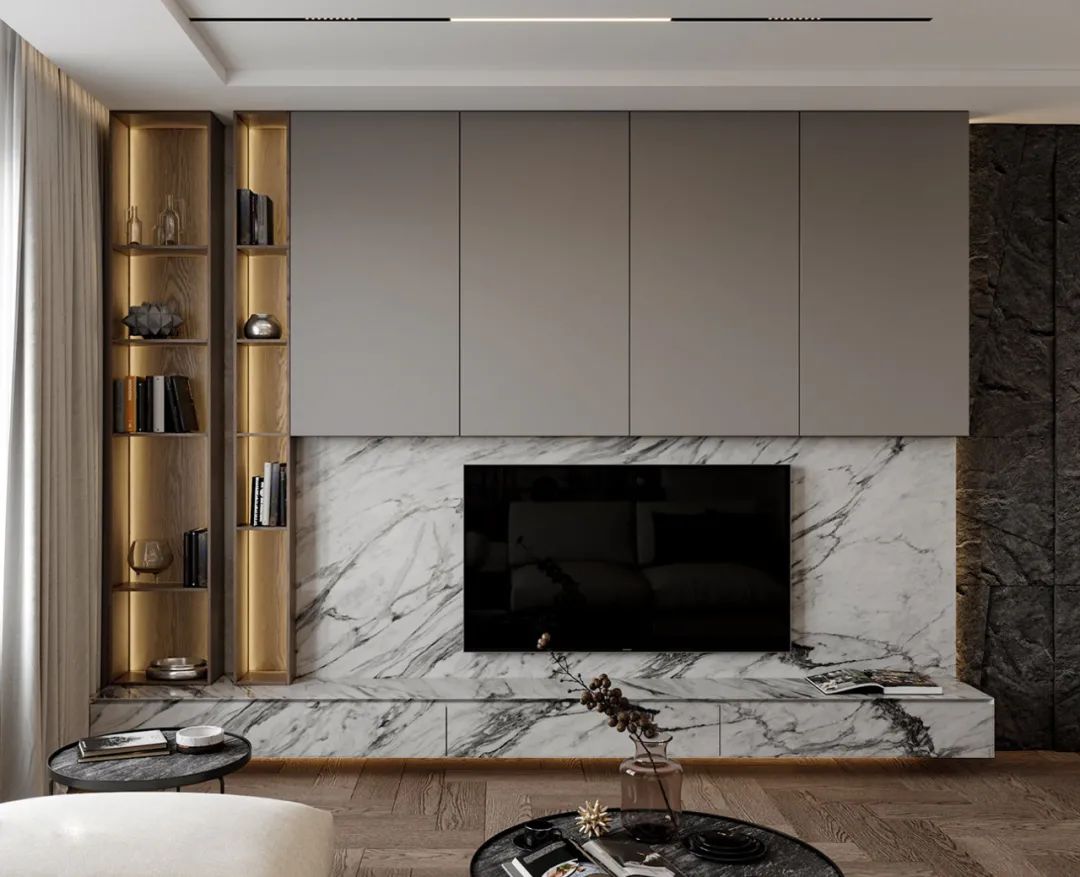 电视背景墙的颜值直接影响客厅颜值,想要营造时尚又不失奢华的视觉效果,石材背景墙是首选。