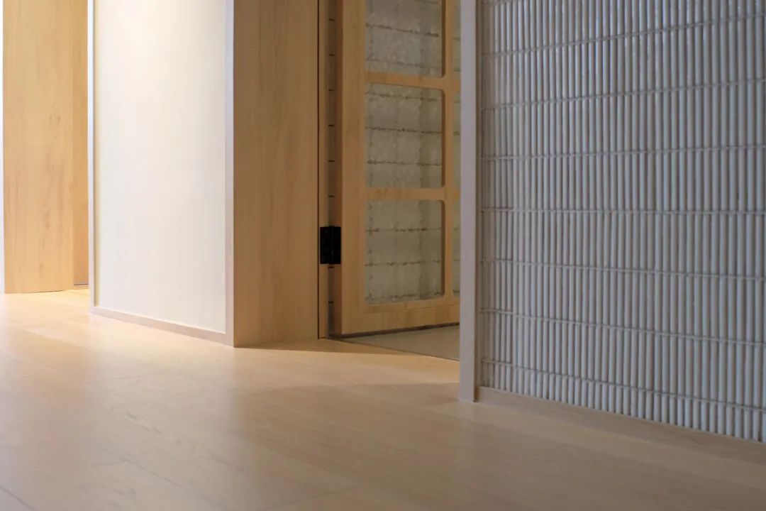 项目位于上海市闵行区,使用面积约43平米,是一家三口在这繁华城市里新的容身之所。前期沟通时我们了解到,业主夫妇从事职业自由度较高,在家办公时间长,需要一个相对独立的工作区域。业主也会在网站上发布一些美食视频,因此对厨房的造型要求也较高。屋主所有的生活方式生活习惯都是极私人化的,针对这些非传统的功能要求,我们也在这43平米内做了许多有趣的尝试。整个空间内的设计意在满足功能需求基本情况下,形成流畅的动线及明亮的生活空间。分区较为合理墙体并做了较大的改动,在原基础之上,主卧内增加了衣帽间贴合屋主需求。设计师拆除了原有的次卧隔断,将原先的公共走道和次卧空间分隔为办公区域及儿童房。考虑到整个户型主要的采光来自于南面阳台,设计师将商业空间内常用的水纹玻璃砖应用至住宅,在保留隐私的同时,将自然光线以极大的可能引入工作间,最后以端景窗户的方式将光线再次引入最内的餐厅。白天阳光条件充足,光线在空间内自然的渗透与伸展,透过水纹玻璃的折射将空间塑造得极为细腻朦胧。▼入口通向儿童房的走道,水纹窗户将光线引入整个空间我们所希望呈现的,是屋主的生活状态对于空间所产生的映射。厨房效仿了日式商业空间的处理手法,大量木制,金属铁艺及复古玻璃在空间内的反复运用,烘托了整个空间内舒适的氛围感,更加贴近生活。摒弃常规住宅的客厅沙发,与三五好友在可开放的厨房餐厅一同共享美食也不错;孩子不再在客厅看电视玩耍,而改为采光最好的阳台进行亲子游戏。卫生间采用了滑轨谷仓门的设计,最大程度节省空间。门板的黑板漆处理方式提供了展示的功能,对于女儿来说也是很好的涂鸦板。自厨房内取景,能够完全拍摄到厨房吧台及黑板门,为屋主的拍摄工作提供便利。储物收纳设计师也进行了考量,在卫生间外围以收纳橱和鞋柜代替了原有的墙面。整个空间内大多采用了移门设计,餐厅也以定制吧台替代传统落地餐桌,尽可能的增加空间使用面积。主卧内单独分离出来的衣帽间保证了卧室功能的纯粹性,考虑到女儿房阳台功能的独立性,设计师将洗衣机及烘干机放置在了衣帽间,由于靠近厨房,走水难度并不大,另在洗衣机下以大理石板作为防水处理。
