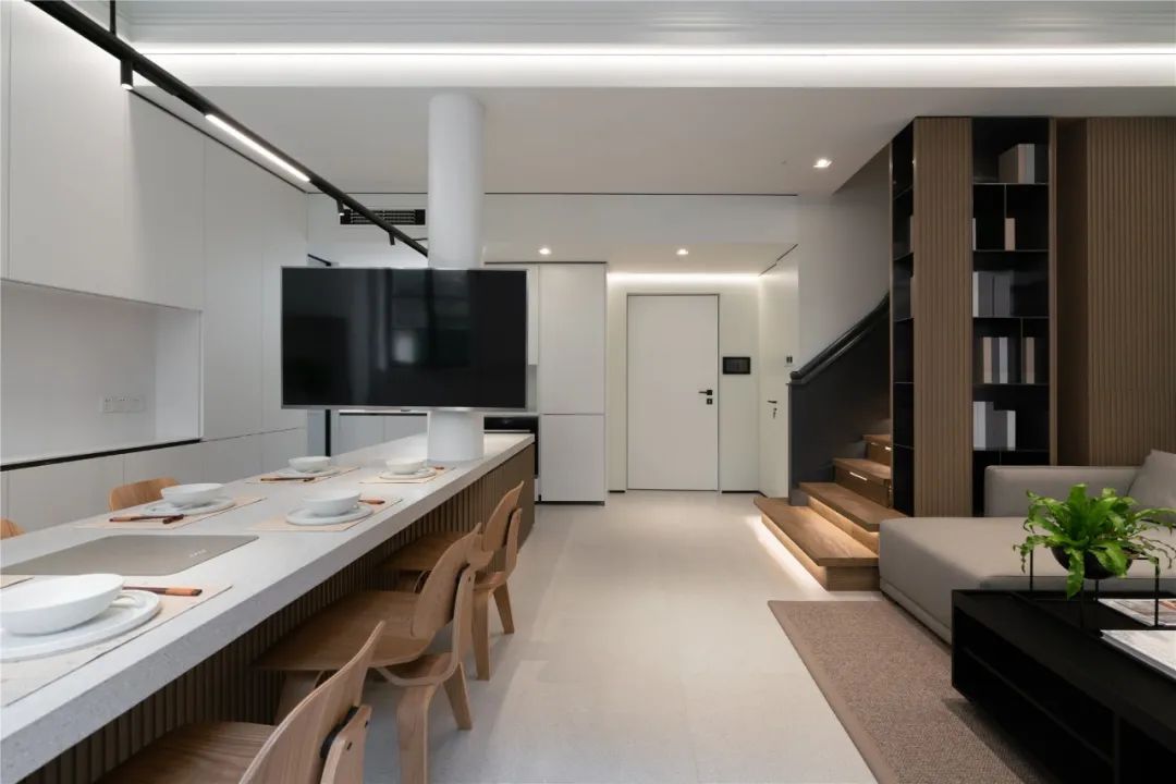 一切安全问题的重中之重,是用钢混桶状结构将老房子整体加固。趁着调整室内承重结构,设计师还重新调整布局,将玄关、客厅、餐厅、厨房、楼梯间相连。整个一楼呈开放式的布局,低饱和度的配色营造出温馨感,三面门窗让视野变得开阔,明亮而典雅。厨房岛台和餐桌合二为一,超大的空间可满足祖孙三代一同用餐。