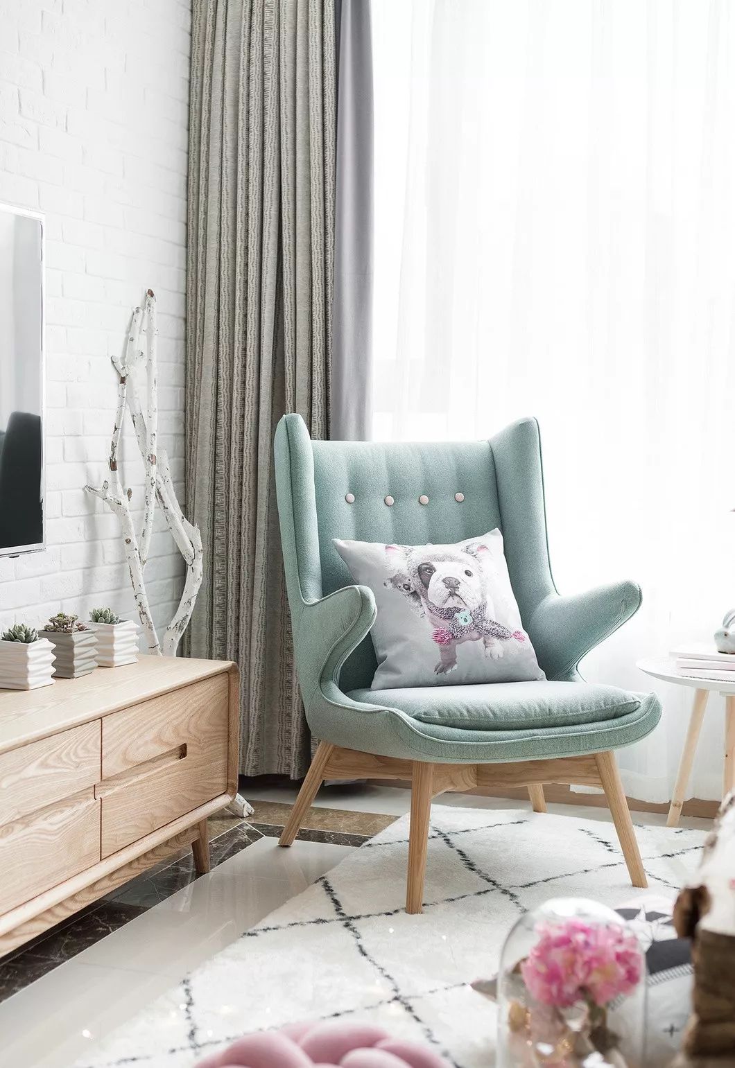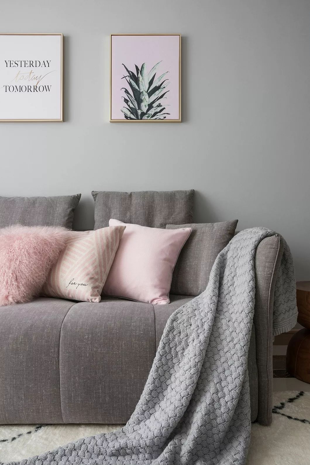 为了打造一个不失优雅与温柔的女性空间,整个空间以高级灰作为背景,装饰同色窗帘,以粉色系的家居饰品为主,并配以简洁的几何及条纹图案,增添现代都市感。
