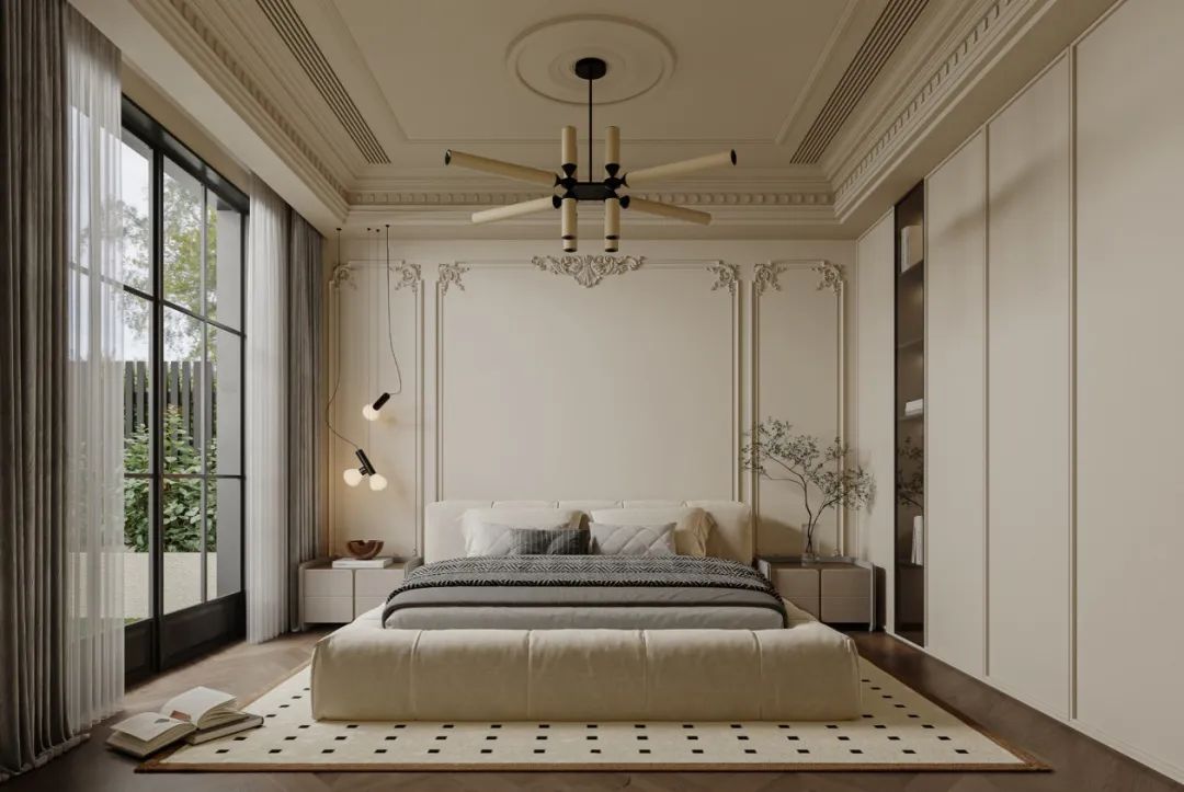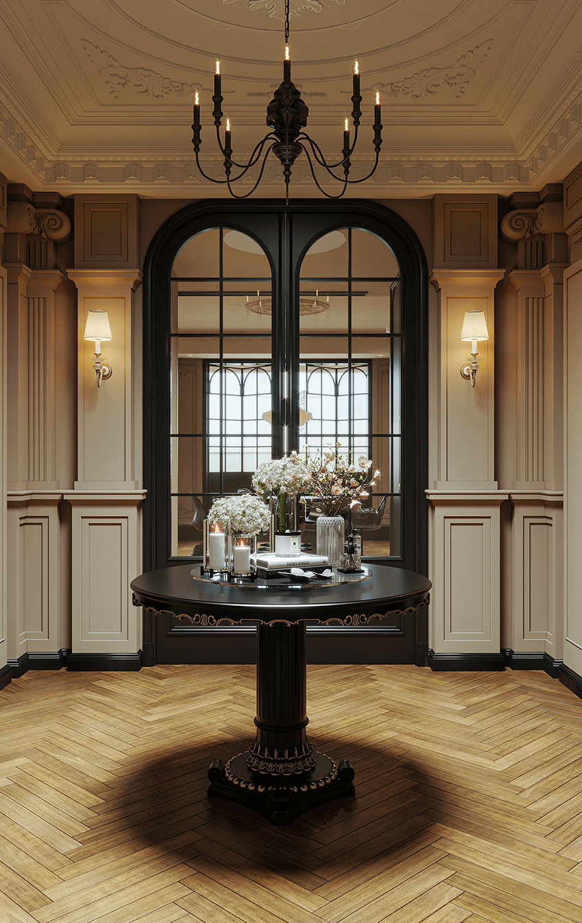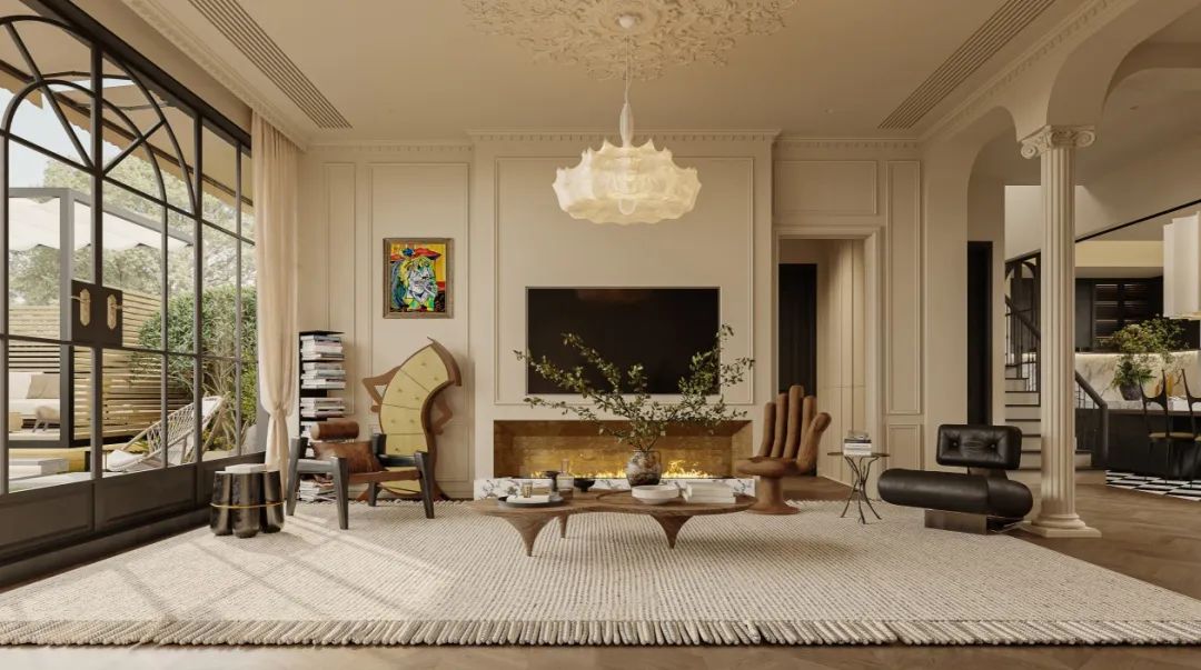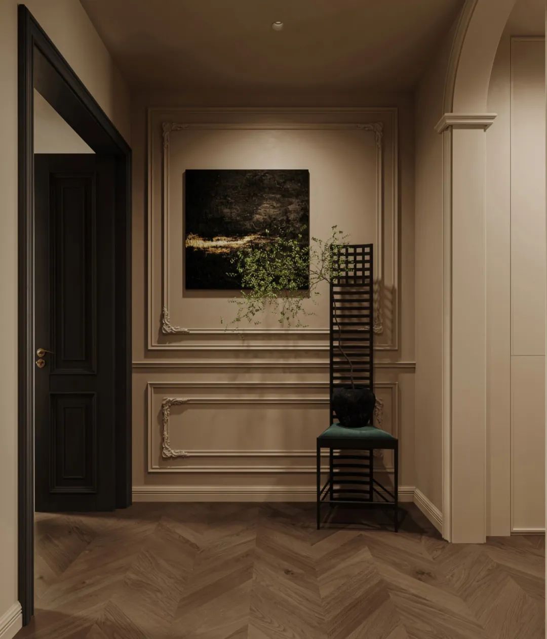 French retro 01 .方寸之间,尽享欢乐 / DESIGN DESCRIPTION / 深邃 温馨 治愈 全屋采用深色木纹砖、焦糖色沙发,体现出法式复古的厚重感,搭配充满艺术感的摆件,让空间更加灵动活泼。开放式的厨房,黑白套色餐椅搭配经典黑色配木纹餐桌,营造出典雅复古的氛围感,上方吊顶用吊灯缓解突兀,视觉体验感满满。主卧整体采用神秘的金色与黑白撞色色调。搭配玻璃门点缀。不同颜色的搭配 使整个空间尽显优雅慵懒气质。 . . . French retro 02· 品悦生活、身心舒惬 / DESIGN DESCRIPTION / 浪漫 清新 雅致 客厅与餐厅空间不做隔断设计,延伸空间视觉效果。阳台与客厅通过线条感的细节,来展现空间优雅与浪漫。白色的柜体搭配上黑色的开放格,既显品质也更具层次,使空间整体性更强。简约的平板柜门时尚又大气。木质纹理的装饰柜,深咖啡色的复古感,外观新颖,凸显空间美感,庄重而不失雅致,大气又高级。U型云朵沙发,外形优雅可爱,质感柔软舒适;搭配上抱枕进行色彩点缀,增加空间的层次感。圆形台灯的装饰,线条的流畅感,简单而又很富有设计。墙面装饰挂画,彰显出装饰画的美妙与动人,提升整个家居空间的气质。实木材质的餐桌搭配上铁艺藤编椅,优雅简约的线条感,勾勒出餐椅的流畅的线条设计,藤编椅子古朴、清爽,让餐厅空间更加悠闲惬意。在空间吊顶设计上,做简约的雕花设计,细致的花纹石膏线,呈现出精致的空间效果,透着法式复古浓浓的浪漫气息,营造空间主次分明的秩序。 . . . French retro 03· 柔硬有余,简繁相谐 / DESIGN DESCRIPTION / 影片感 高级 气质