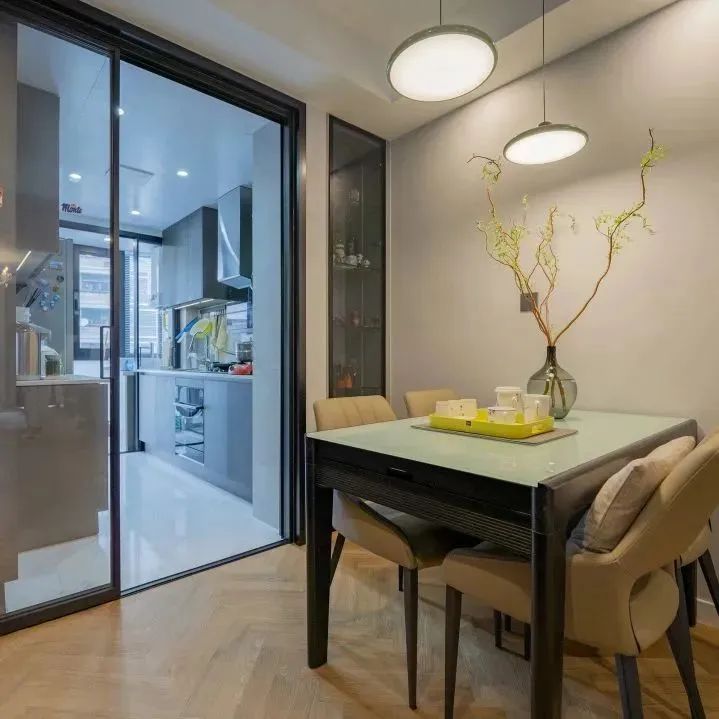 这套房子,平常主要是父女两人居住,在保留业主喜欢的风格元素与家具的基础上,设计师利用不同的色彩与简单的饰物搭配,为两位业主分别保留了足够的私人空间,并在生活习惯上求同存异,实现了父女两辈的理想生活。 (设计方案) 01.客厅 客厅保留了原有的沙发,然后搭配上高脚设计的茶几,造型和谐简约。 客厅浅灰色石膏线背景墙、灰色窗帘、石膏线吊顶以及灯具的颜色相互呼应,营造轻法式的空间氛围。 人字形拼接的木地板,将现代与法式巧妙中和,让整个空间变得和谐。 业主已经退休,平日里除了接送女儿上下班之外,最大的爱好就是喝喝茶、养养花,生活节奏自在悠闲。 在本次装修中,客厅的地台也被保留,用来放置业主心爱的绿植,这一方小天地也是业主最喜欢的地方,经常一待就是一下午。 从客厅过渡到餐厅的这块儿区域,放了业主女儿看中的两张单人沙发,设计师也将墙体涂刷成了蓝灰色,使空间和谐且更有质感。 02.餐厅 餐边柜和餐桌也是原来的家具,两边的墙面颜色延续客厅的墙面配色。 设计师将餐厅和厨房之间的门洞扩大,用灰色玻璃移门代替透明玻璃移门,提升质感,也遮挡了餐厅与厨房之间部分视线。 另外,利用墙面打造内嵌式收纳餐边柜,不额外占用餐厨空间,还兼顾收纳与展示功能。 增加 收纳 ★ 03.厨房 利用定制柜,把蒸烤箱、洗碗机都安置妥当。橱柜呈阶梯型展现,与双开门冰箱相互呼应。 橱柜面漆采用钢琴烤漆,不仅耐磨,抗污能力还强,清洁也更方便。 04.卧室 两个房间都以舒适性为主,除了床、衣柜和桌子以外没有额外的装饰,简洁大方。 墙壁颜色都与窗帘元素相呼应,保证色调的一致性。主卧小清新,女儿房粉嫩,两个房间和而不同,各有其特点。 05.卫生间 原始卫生间动线不合理,如厕区刚好卡在洗漱和淋浴区中间,很容易就会产生磕碰。 设计师将淋浴区与洗漱台盆往窗边平移,充分利用好角落空间,再利用扁管移位器,将如厕区挪到原来的淋浴区,动线清晰,进门区域也被成功释放,日后使用会更加方便。