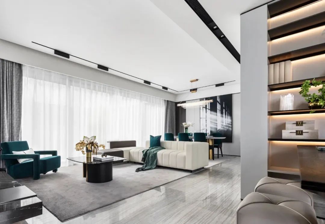 线条感十足的金属吊灯,大理石餐台搭配丝绒质感的孔雀蓝餐椅,传递着就餐区的细腻格调。理性线条与感性色调间的平衡,造就空间在视觉和使用中的舒适度和愉悦感。
