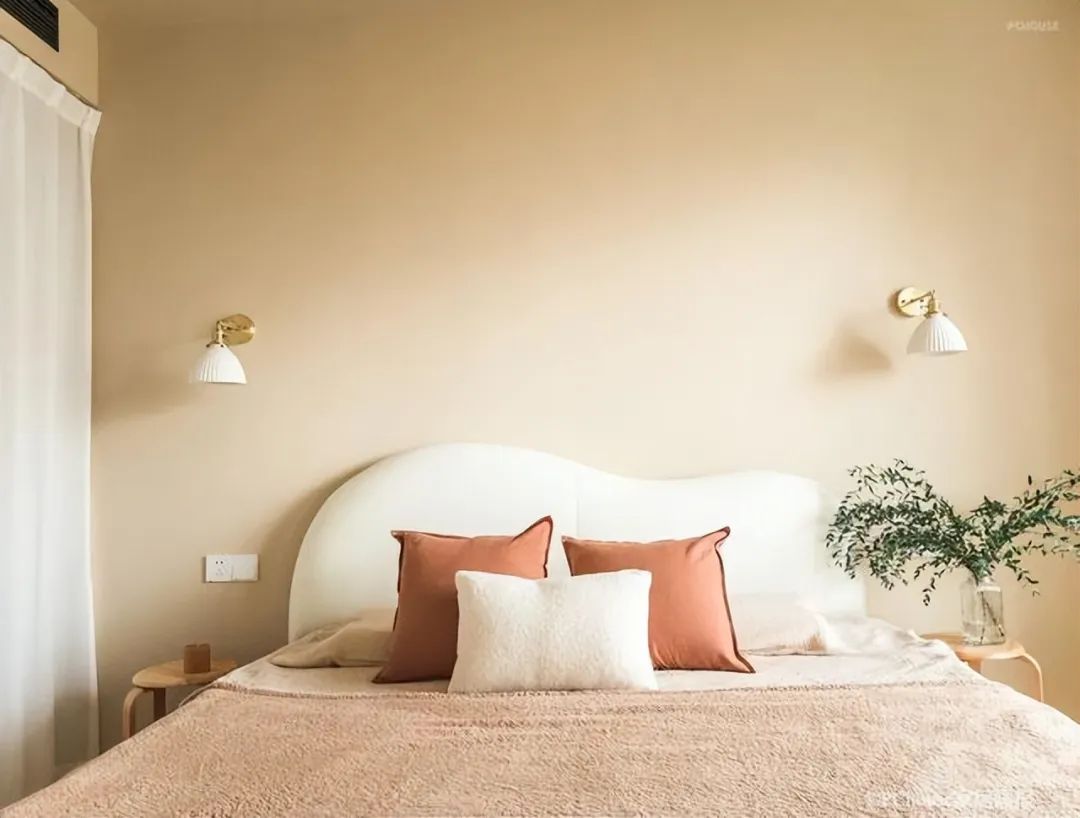 推门而入,整个主卧的色调虽然也是原木奶油风,但是墙面颜色比客餐厅略深,床头靠背的颜色又比墙面深,增强了空间的层次感。主卧没有定制衣柜,而是做了嵌入式的小型衣帽间,用白纱帘做隔断,女主说这样既环保、省钱,用起来也方便,收纳量也更多。