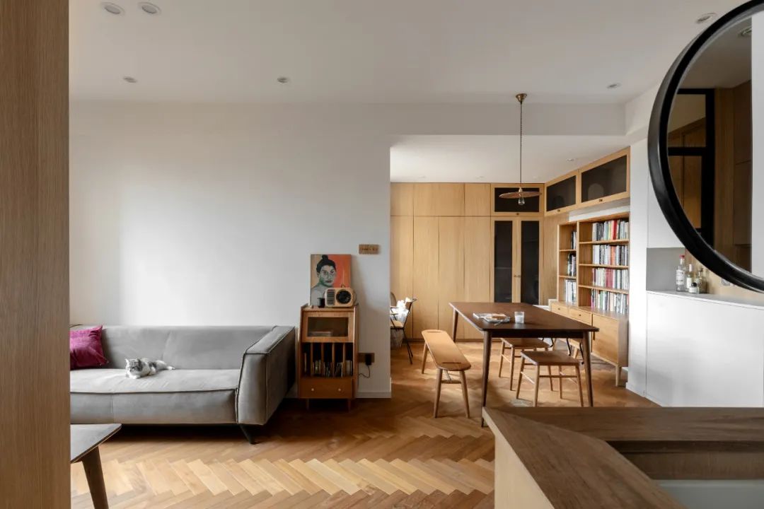 上海《莲康苑》53平原木风装修设计,客厅不装电视和投影,独立洗手台+壁龛设计,效果超赞!