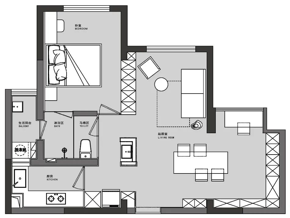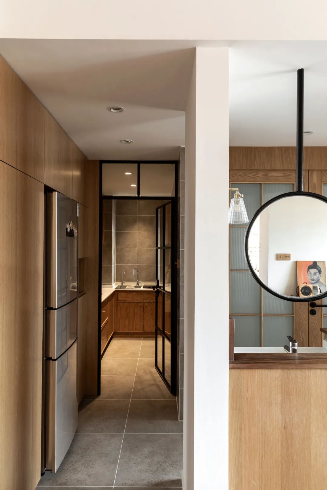 ▲ 平面布局图 玄关 ▲ 高低差落尘区 ▲ 餐厅望向室内 拆除了原厨房、卫生间、主卧、次卧的非承重墙体,以洗手台为中心,空间进行了细微的重组,在室内形成洄游式动线。 客厅 餐厅 手作区 厨房 卧室 ▲ 客厅看向主卧 ▲ 细腻光影 卫生间三分离,私密的淋浴区从卧室进出,用长虹玻璃门进行分隔,墙体内嵌壁龛,放置洗漱用品。 卫生间