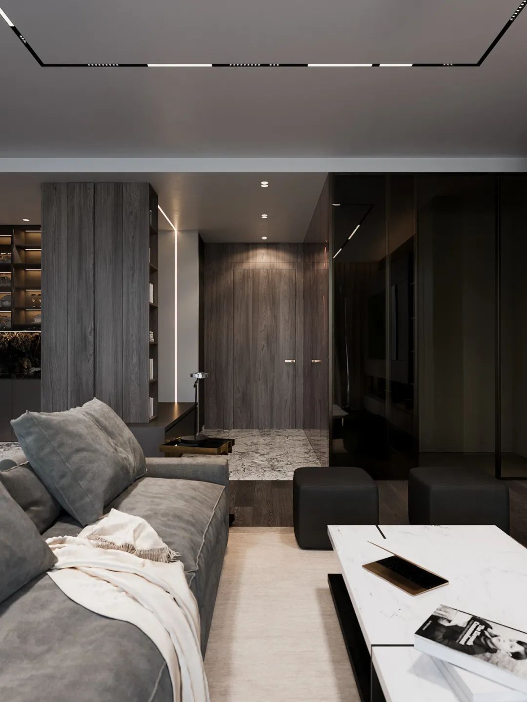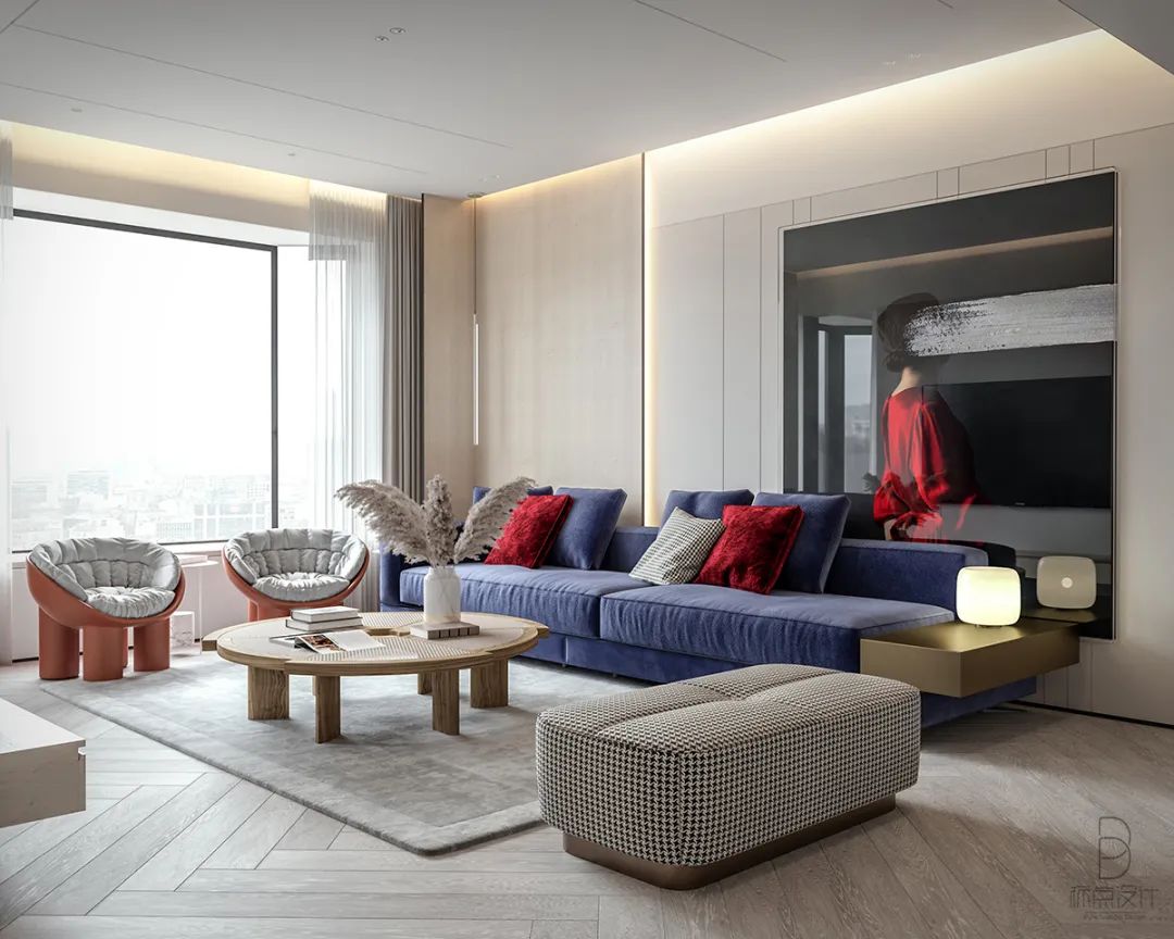 在电视墙或沙发墙上有房门的话,如果直接装门可能会影响空间的整洁统一视觉,而通过木饰面的设计,就可以把房门+木饰面组合,设计成隐形门,让空间显得更加舒适自然。