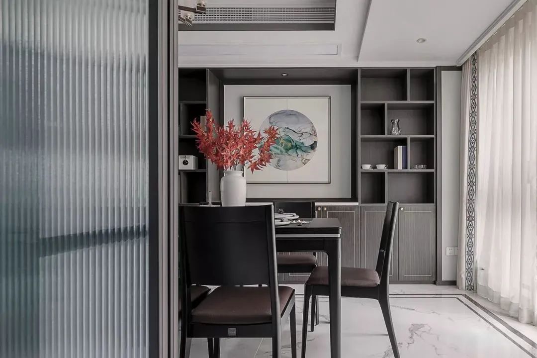 餐区背景设立中式橱柜,入墙式设计使得空间整体化一,开放式展示柜结合封闭柜体,中间以景造势, 获得更充足的收纳储物空间。