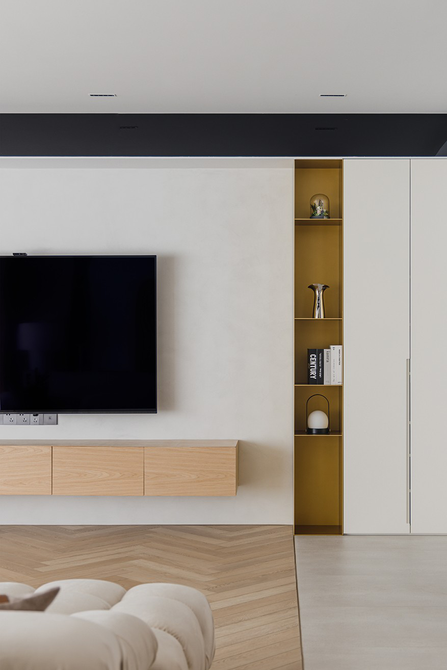 纯色的电视背景墙,搭配多功能的收纳柜,去繁留简,将极简自然的风格发挥到极致。