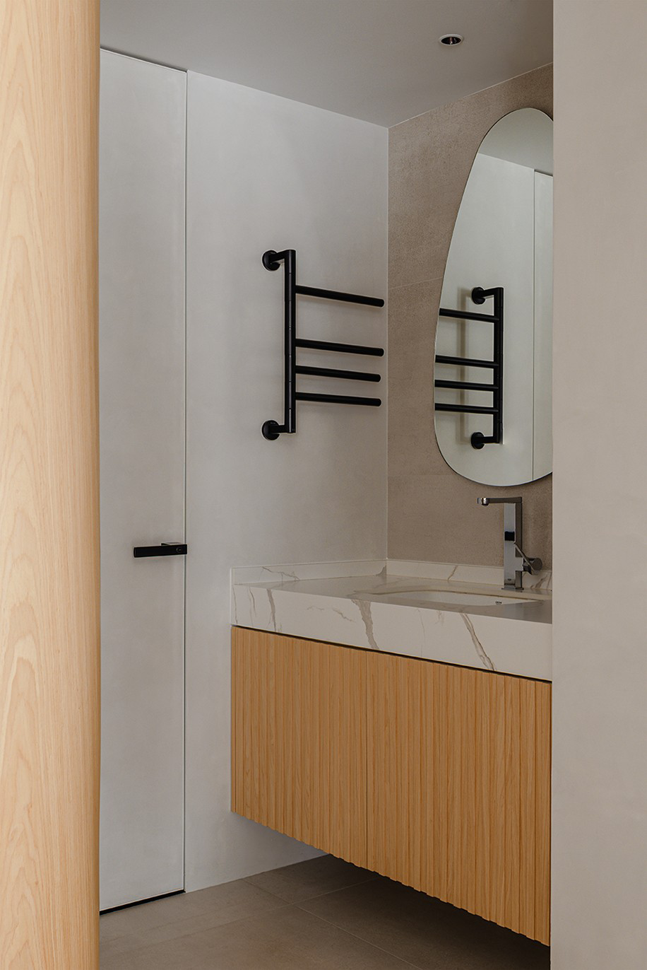 次卧和主卧也通过隐形的口袋门设计保持了互通性,拓展了空间的视野特别是飘窗的光线的引入。